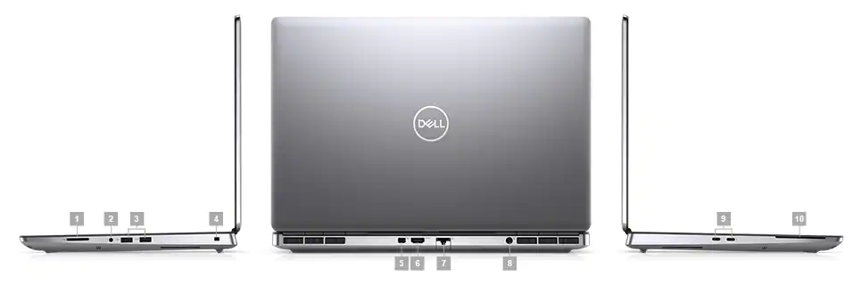 1. SD 卡讀卡器 | 2.耳機插孔 | 3.2 個 USB 3.2 第 1 代 Type-A 端口,支持 PowerShare | 4.線纜鎖槽 | 5.迷你 DP 1.4 端口 | 6.HDMI 2.1 端口 | 7.RJ-45 端口 | 8.電源端口 | 9.2 個 USB 3.2 第 2 代 Type-C® Thunderbolt 4.0 端口 | 10.智能卡讀卡器(可選)